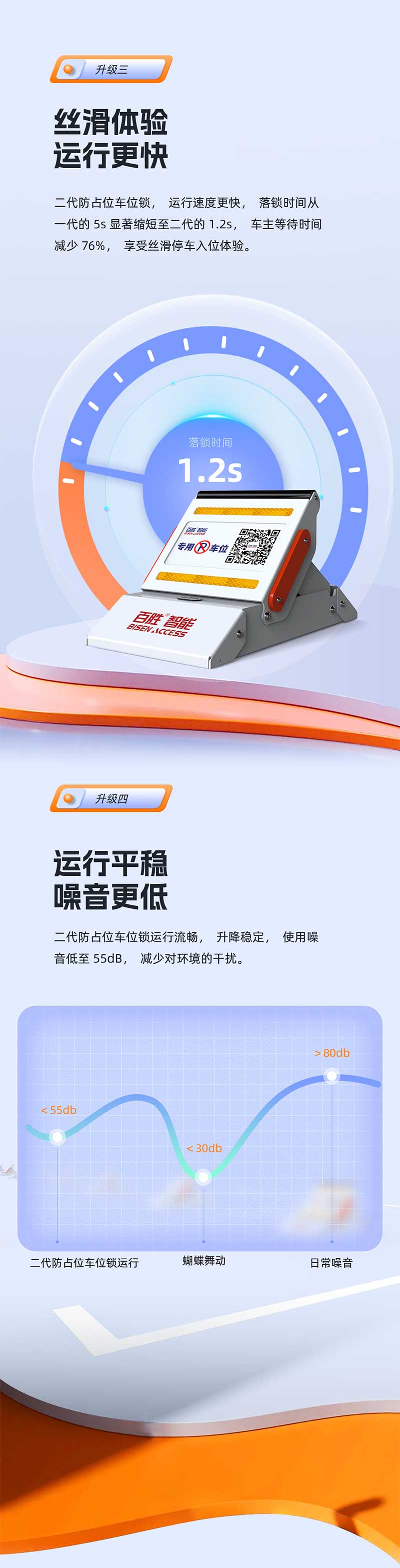 3、絲滑體驗運行更快:二代防占位車位鎖,運行速度更快,落鎖時間從一代的5s 顯著縮短至二代的1.2s,車主等待時間減少76%,享受絲滑停車入位體驗。