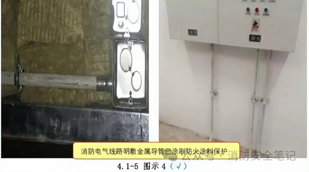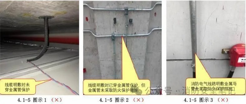 問題描述: 1)消防配電線纜明敷時未穿管(或已穿管但非金屬管)保護【圖示1];2)金屬導(dǎo)管或封閉式金屬槽盒未采取防火保護措施(當(dāng)采用阻燃或耐火電纜并敷設(shè)在電纜井、溝內(nèi)時以及采用礦物絕緣類不燃性電纜除外)【圖示2]【圖示3];3)暗敷在不燃性結(jié)構(gòu)層內(nèi)時保護層厚度未達到30mm 要求。