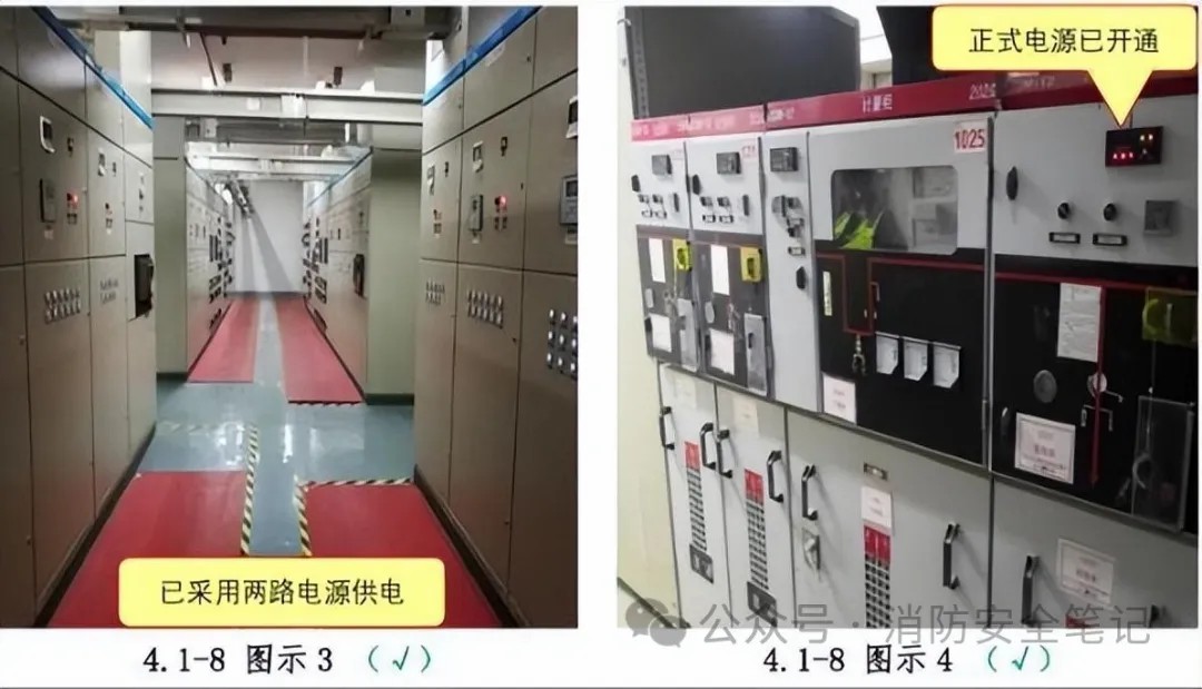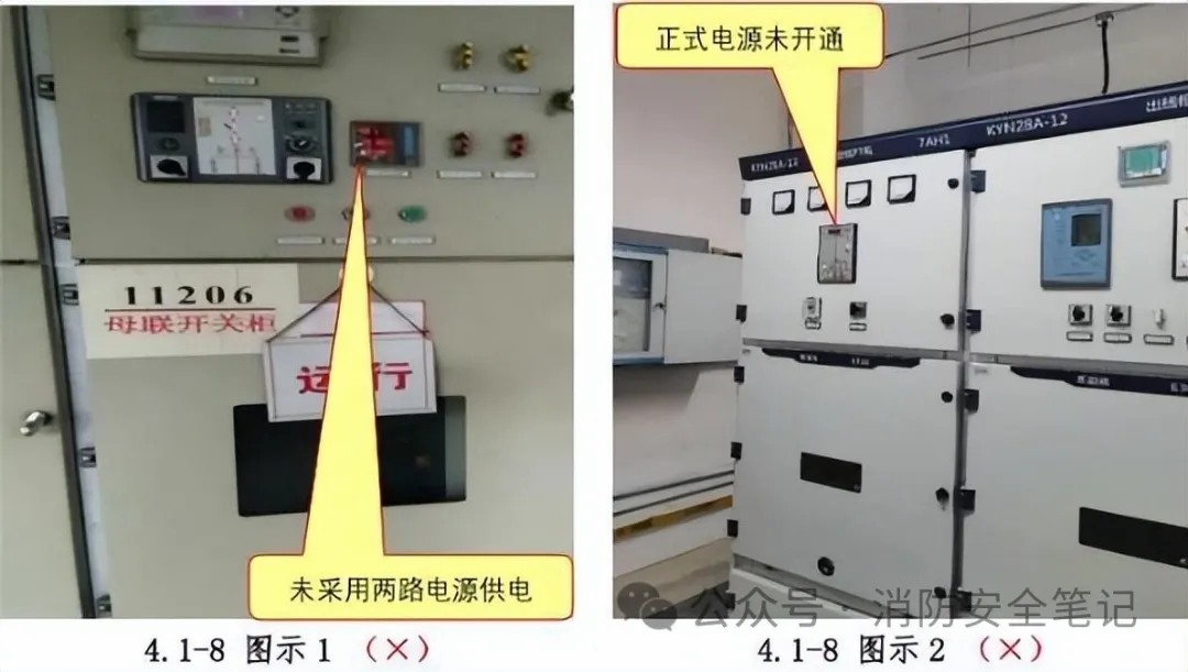 問題描述: 1)消防系統(tǒng)供電未采用雙重電源;[圖示1)2)一級負荷供配電系統(tǒng)已施工完畢,但供電部門還沒有正式送電;3)項目供配電系統(tǒng)未施工調(diào)試完畢,暫時無法達到消防用電的負荷等級要求?!緢D示2]