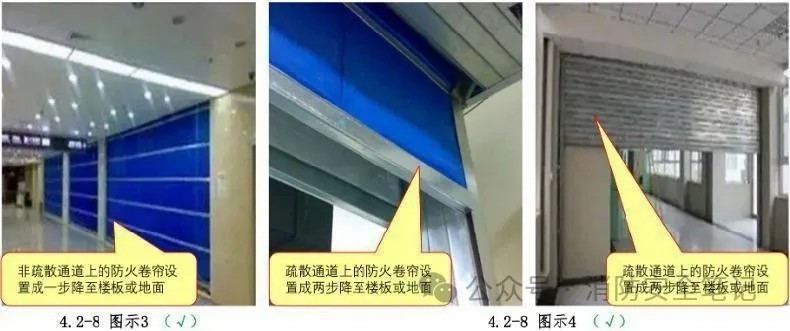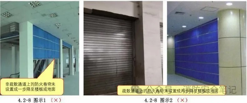問題描述: 非疏散通道上的防火卷簾未設(shè)置成一步降至樓板或地面,疏散通道上的防火卷簾未設(shè)置成兩步降至樓板或地面。【圖示1]【圖示2]