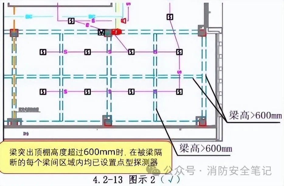 原因分析: 1)探測器、燈具、送風(fēng)口等設(shè)備分屬不同的專業(yè),其平面布置在不同的專業(yè)圖紙上體現(xiàn),因此,在設(shè)計階段出現(xiàn)設(shè)備之間距離不滿足規(guī)范要求的情況不易及時發(fā)現(xiàn);2) 很多項目預(yù)埋由機電總承包完成,導(dǎo)致預(yù)埋的相關(guān)施工人員由于對規(guī)范不太熟悉,忽略了探測器與梁、墻等距離不滿足規(guī)范要求;3)施工單位在施工時,未能及時發(fā)現(xiàn)問題提請建設(shè)單位和設(shè)計單位做出協(xié)調(diào)、變更。相關(guān)規(guī)范: ☆《火災(zāi)自動報警系統(tǒng)設(shè)計規(guī)范》(GB50116-2013)第6.2.4條、第6.2.5條、第6.2.6條【圖示4】、第6.2.7條、第6.2.8條【圖示5]。正確做法: