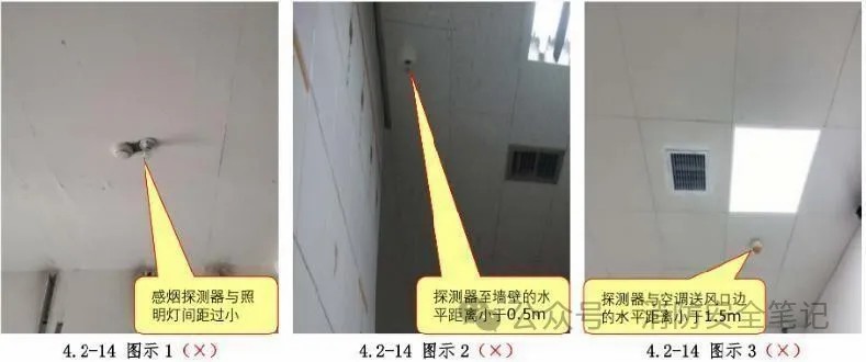 問題描述: 現(xiàn)場點型探測器設(shè)置不符合規(guī)范要求的有:1)點型探測器與照明燈間距過小【圖示1];2) 點型探測器至墻壁的水平距離小于0.5m[圖示2]:3)點型探測器距空調(diào)送風(fēng)口邊的水平距離小于1.5m[圖示3]。
