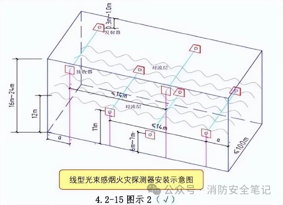 措施: 1.當(dāng)頂棚高度不大于5m時,探測器的紅外光束軸線至頂棚的垂直距離為0.3m;當(dāng)頂棚高度為10m~20m時,光束軸線至頂棚的垂直距離口為1.0m ;2.相鄰兩組線型光束感煙火災(zāi)探測器的水平距離不應(yīng)大于14m。探測器至側(cè)墻水平距離不應(yīng)大于7m且不應(yīng)小于0.5m。探測器的發(fā)射器和接收器之間的距離不宜超過100m;3.采用分層組網(wǎng)的探測方式,除按原規(guī)范規(guī)定設(shè)置在建筑頂部外,在建筑高度不超過16m時,在6m~7m處增設(shè)探測器;在建筑高度超過16m但不超過26m時,在6m~7m 和11m~12m 處各增設(shè)一層探測器。 |