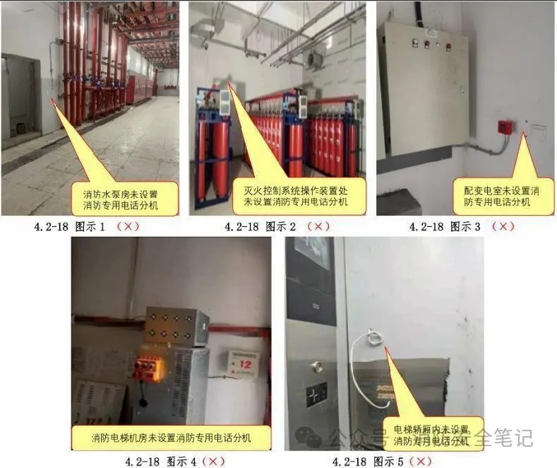 問題描述: 消防水泵房、發(fā)電機房、消防值班室、消防電梯機房、電梯轎廂內(nèi)、滅火控制系統(tǒng)操作裝置處等未設(shè)置消防專用電話分機。[圖示1]【圖示2]【圖示3]【圖示4]【圖示5]]。