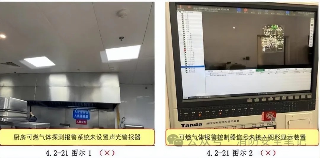 問題描述: 1)廚房(不包括住宅建筑內(nèi)的廚房)可燃氣體探測報警系統(tǒng)未設(shè)置火災(zāi)聲光警報器;【圖示1)2)可燃氣體探測器直接接入火災(zāi)報警控制器的探測器回路;3)可燃氣體報警控制器的報警和故障信息,未在消防控制室圖形顯示裝置顯示。【圖示2]。