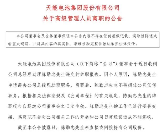 另據(jù)8月28日消息,天能股份發(fā)布公告,因個(gè)人原因,陳勤忠申請(qǐng)辭去總經(jīng)理助理職務(wù),離職后,陳勤忠不再擔(dān)任公司任何職務(wù)。