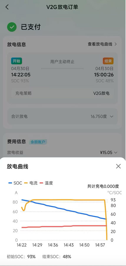 在超充站,郭誠(chéng)剛向研究員展示了車主如何通過車網(wǎng)互動(dòng)放電。在40分鐘內(nèi),電動(dòng)汽車通過車網(wǎng)互動(dòng)放電約16.75度電,收入15.05元。郭誠(chéng)剛談到,一般在工作日上班時(shí)間,車主可通過手機(jī)APP選擇充電結(jié)束時(shí)間,同時(shí)設(shè)置放電模式,實(shí)現(xiàn)充放電。以中環(huán)大場(chǎng)超充站為例,如果按照每個(gè)車網(wǎng)互動(dòng)雙向充電樁每天放電1次(40度電/次)來算,預(yù)計(jì)年充/放電量可達(dá)2.8萬度。