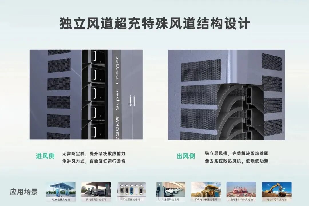 基于優(yōu)優(yōu)綠能40kW/60kW/125kW·IP65獨(dú)立風(fēng)道充電模塊的高防護(hù)、高效率、低噪音、免維護(hù)等特性,打造的獨(dú)立風(fēng)道兆瓦超充解決方案,可滿足城市公共充電、高速國(guó)道、礦廠工程等多種兆瓦超充應(yīng)用場(chǎng)景。方案設(shè)計(jì)了雙列橫向模塊擺放設(shè)計(jì),結(jié)合獨(dú)特的風(fēng)道結(jié)構(gòu)設(shè)計(jì),進(jìn)風(fēng)側(cè)無(wú)需防塵棉有效提升系統(tǒng)散熱能力,側(cè)進(jìn)風(fēng)可有效降低運(yùn)行噪音;出風(fēng)側(cè)采用了獨(dú)立導(dǎo)風(fēng)槽,免去系統(tǒng)散熱風(fēng)機(jī),進(jìn)一步解決散熱問(wèn)題,又能同時(shí)降低噪音和降低系統(tǒng)功耗。