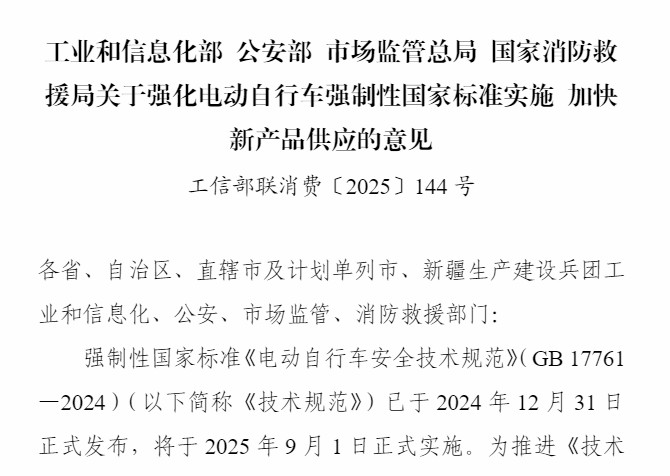 由工業(yè)和信息化部 公安部 市場(chǎng)監(jiān)管總局 國(guó)家消防救援局發(fā)布《關(guān)于強(qiáng)化電動(dòng)自行車(chē)強(qiáng)制性國(guó)家標(biāo)準(zhǔn)實(shí)施 加快新產(chǎn)品供應(yīng)的意見(jiàn)》2025年7月發(fā)布
