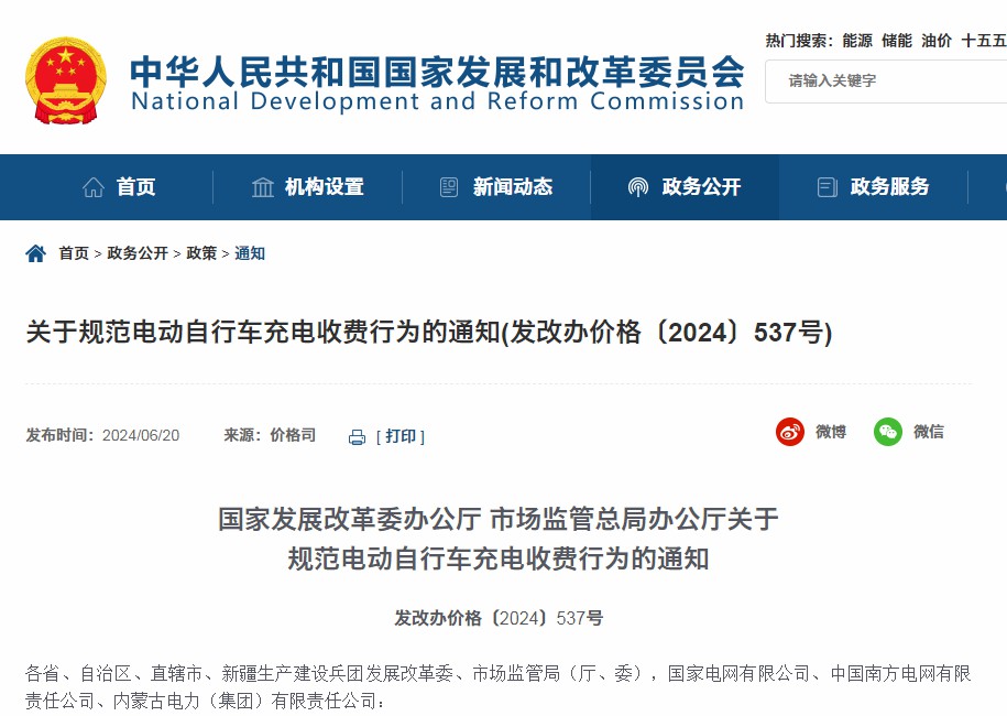 2024年6月,國(guó)家發(fā)展改革委辦公廳 市場(chǎng)監(jiān)管總局辦公廳《關(guān)于規(guī)范電動(dòng)自行車(chē)充電收費(fèi)行為》的通知