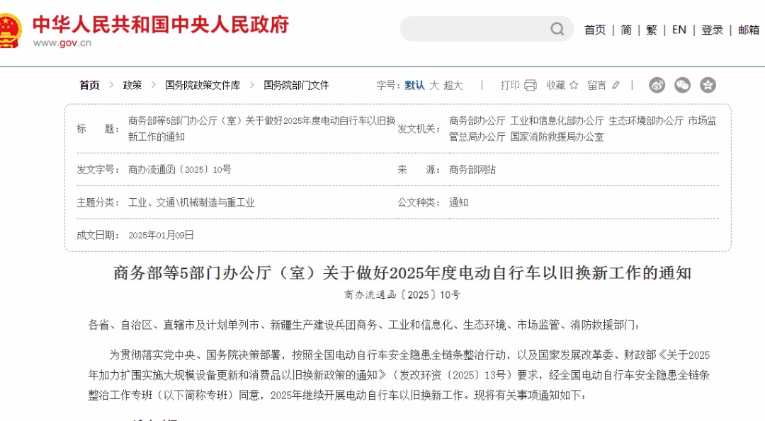 商務(wù)部等5部門(mén)辦公廳(室)《關(guān)于做好2025年度電動(dòng)自行車(chē)以舊換新工作》的通知。