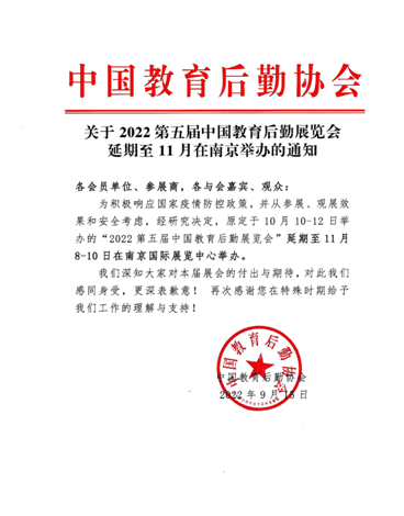 為積極響應國家疫情防控政策,并從參展、觀展效果和安全考慮,經研究決定,原定于10月10-12日舉辦的“2022第五屆中國教育后勤展覽會”延期至11月8-10日在南京國際展覽中心舉辦。