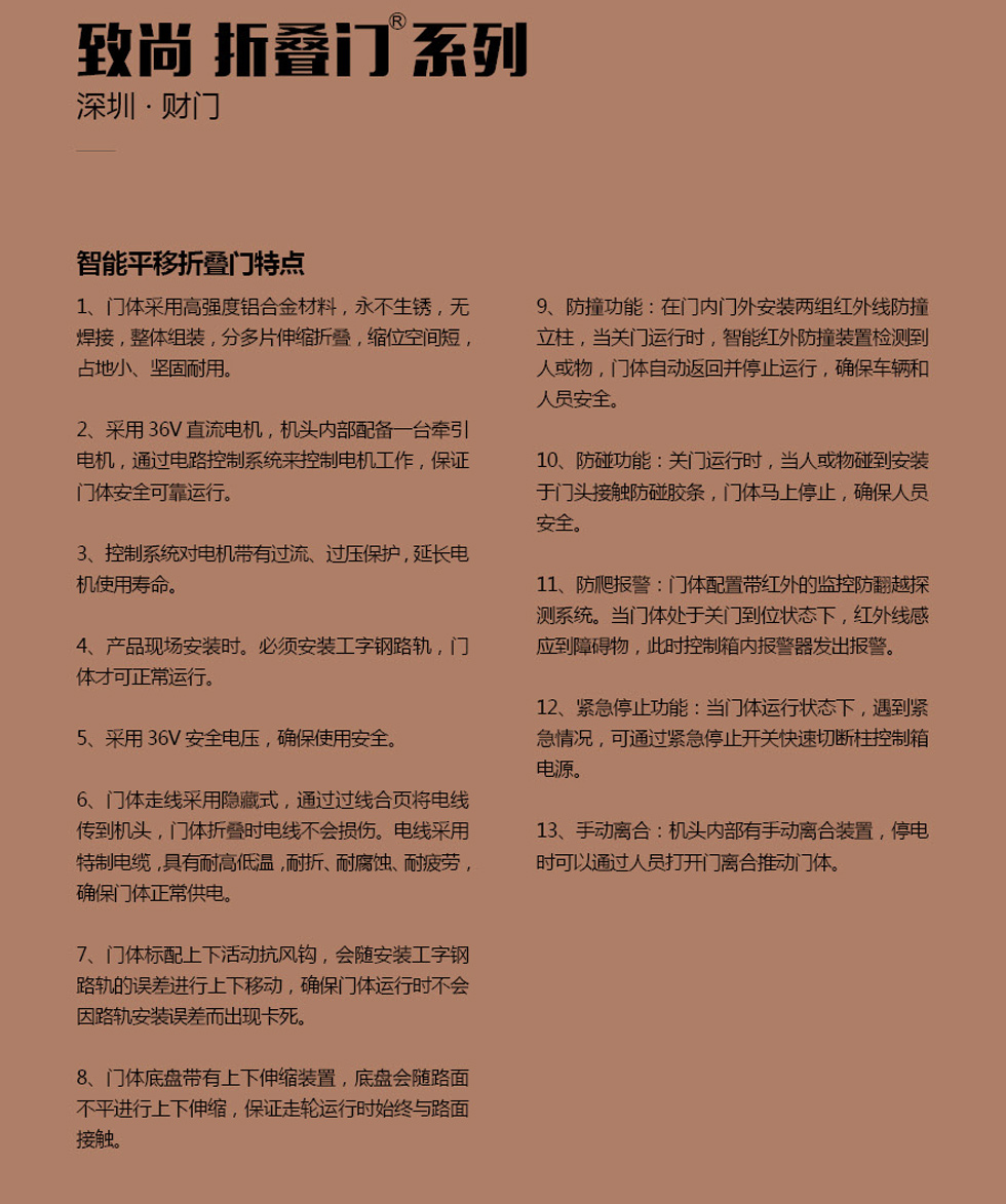 10、防撞功能:關(guān)門運(yùn)行時(shí),當(dāng)人或物碰到安裝于門頭接觸防觸防碰膠條,門體馬上停止,確保人員安全。