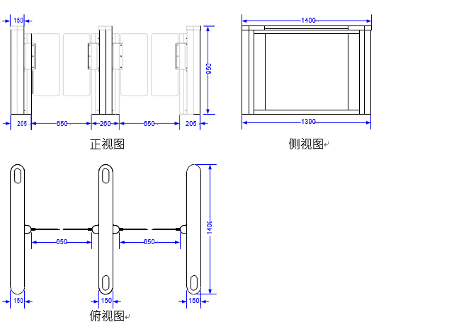 智能人行擺閘尺寸:機箱長1.4米,通道寬0.65米