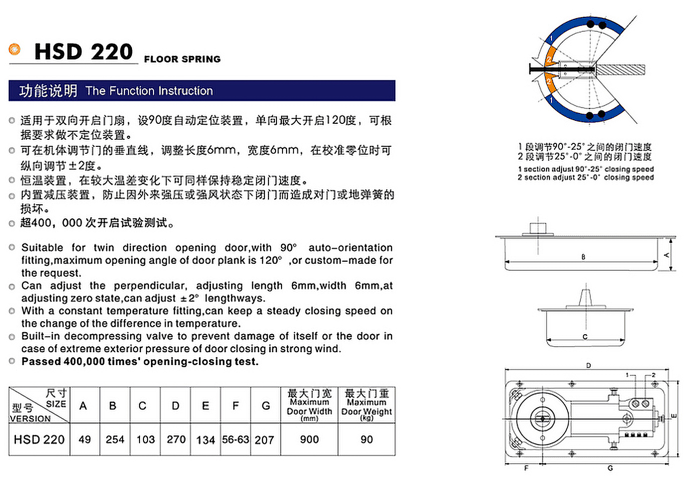 主要特點(diǎn): 適用于雙向開啟門扇,設(shè)90度自動(dòng)定位裝置,單向最大開啟120度,可根據(jù)要求做不定位裝置。
