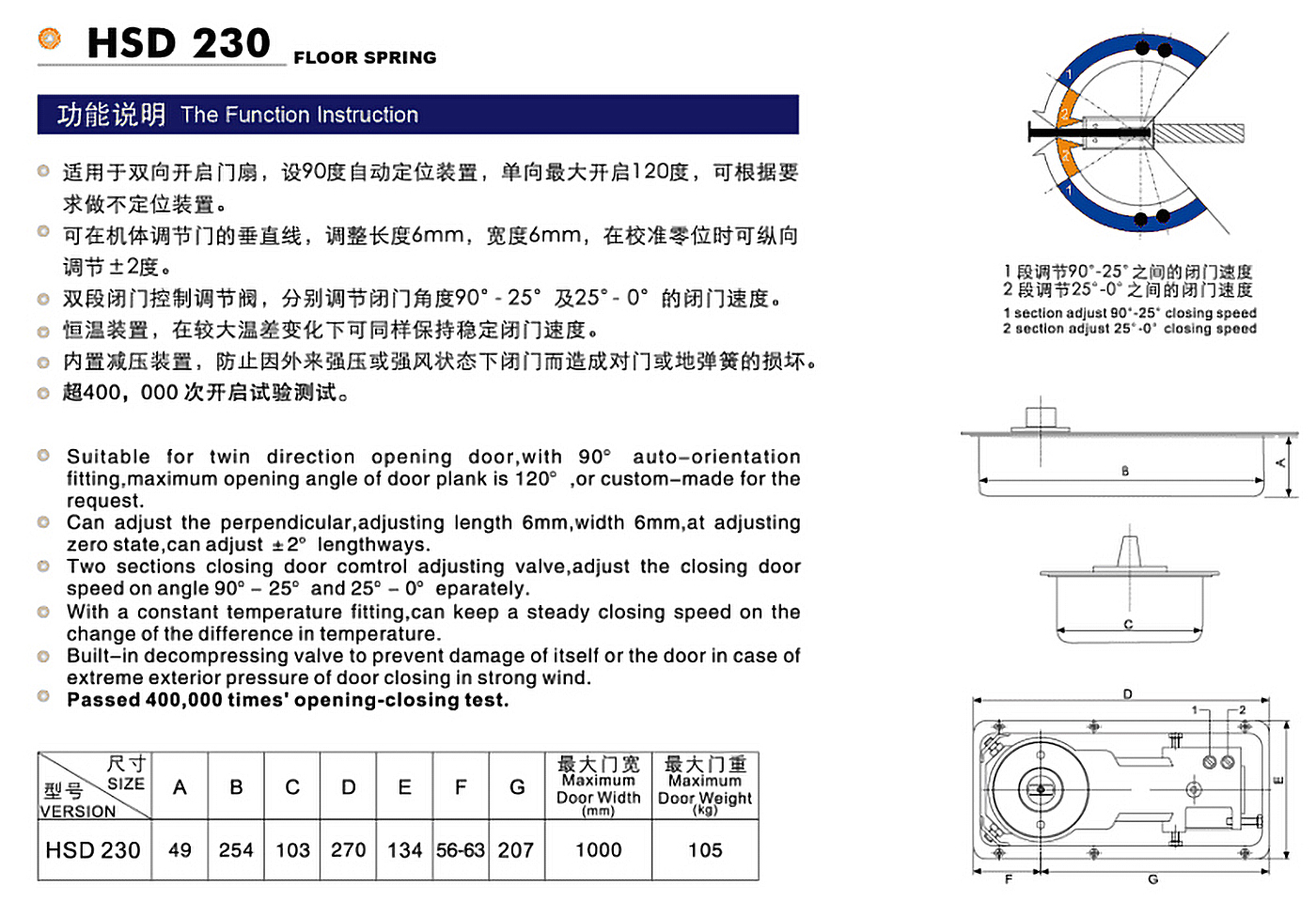 主要特點(diǎn): 適用于雙向開啟門扇,設(shè)90度自動定位裝置,單向最大開啟120度,可根據(jù)要求做不定位裝置。
