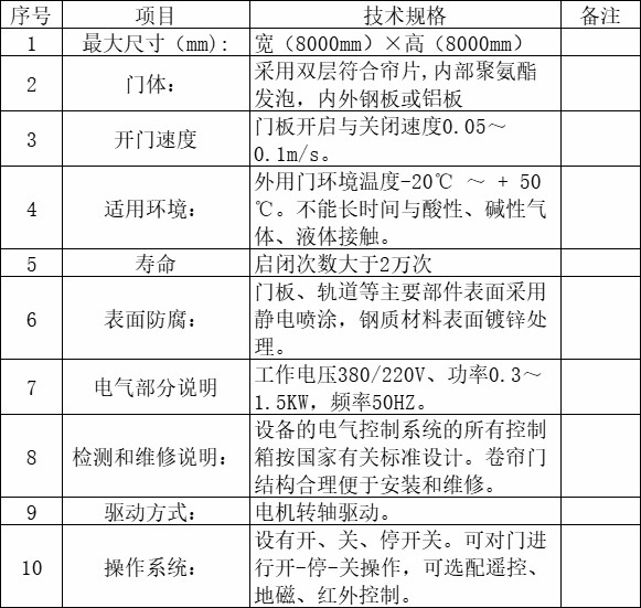 4、電機(jī):采用卷簾門專用一體化電機(jī),具有過熱保護(hù)功能,開門速度0.1~0.2m/s。