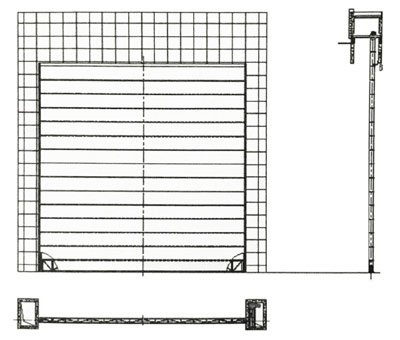 上疊式飛機庫大門主要有立柱、軌道、上下過梁、簾布固定架、簾布、繩輪、提升機構、安全系統、控制系統等部件組成。其中過梁和簾布固定架采用優(yōu)質型鋼制造,簾布選用一定強度PVC簾布。當提升機構工作時,提升機上的鋼絲繩拉動下過梁上移,將簾布固定架和簾布疊加在下過粱上,開啟到位后,由上行程限位開關限位。當提升機構反向運動,下過梁下移,實現門體的關閉。在關門到位時,由布設在繩輪上的行程限位開關限位。在門體運行過程中,如出現鋼繩斷裂,安全保險機構作用,防止門體墜落??刂撇捎肞LC變頻控制變頻,門體在運行過程中緩啟緩停。主要適用于大型船廠、大型工業(yè)車間、飛機庫等場合,