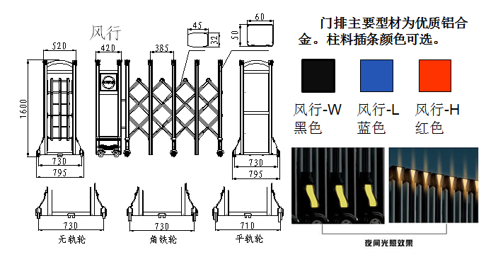南北德信風(fēng)行-W鋁合金伸縮門門體采用公司自行加工優(yōu)質(zhì)不銹鋼和鋁型材等材料制作,主框架采用立體四維平行原理鉸接,伸縮靈活。伸縮門主要由門體、驅(qū)動器、控制系統(tǒng)構(gòu)成。驅(qū)動器采用特種電機(jī)驅(qū)動,蝸輪蝸桿減速,并設(shè)有手動離合器,停電時可手動啟閉,控制系統(tǒng)有臺控及遙控兩種。可配備滾動顯示屏,顯示個性文字內(nèi)容。還可選配備智能紅外線探頭防碰撞裝置,運(yùn)行時遇人或異物20-30CM可自動返回運(yùn)行,從而保障車輛及行人的安全。適用于工礦企業(yè)、機(jī)關(guān)院校、娛樂場所、賓館飯店等庭院圍墻門。起到美化環(huán)境、改善企業(yè)面貌、提升企業(yè)形象;有助于營造文明社會、文明企業(yè)、文明城市氣氛;