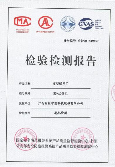 在公安三所的權(quán)威檢驗下,百勝重型道閘門符合“GA/T 1132-2014《車輛出入口電動欄桿機(jī)技術(shù)要求》及Q/BSZN 017-2018《重型道閘門企業(yè)標(biāo)準(zhǔn)》”要求。