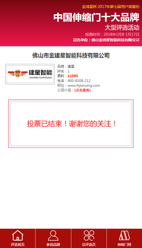 2018年新年伊始,在由中國伸縮門網(wǎng)舉辦的2017年“中國伸縮門十大品牌”評選活動中,建星智能再次榮膺用戶喜愛的伸縮門品牌第一名。本次評比,行業(yè)內(nèi)知名企業(yè)云集,建星智能獲得本次評比冠軍體現(xiàn)了廣大用戶對建星品牌的高度認可。20多年以來,建星人一直秉承“傾注精心,鑄就專業(yè)”的工匠精神,專注于伸縮門的研發(fā)制造,一直屹立于伸縮門行業(yè)的發(fā)展的前列。建星人信奉“以人為本,服務(wù)客戶”的理念,著力打造“天下建星是一家,相親相愛建星人”的品牌文化。 新的一年,公司將持續(xù)提高服務(wù)水平,更加重視產(chǎn)品質(zhì)量,持續(xù)完善教育和培訓(xùn)系統(tǒng),全面提升企業(yè)形象!