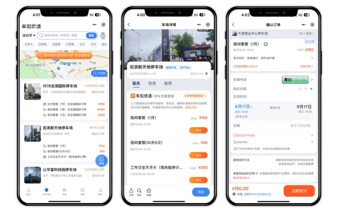 停車需求會因為業(yè)態(tài)存在明顯的潮汐效應(yīng),如寫字樓白天滿晚上空,景區(qū)節(jié)假日繁忙工作日空閑等等,大浪街道及捷停車運(yùn)營經(jīng)理經(jīng)實(shí)地走訪后,以不同業(yè)態(tài)進(jìn)行互補(bǔ),設(shè)計包括日卡、次卡、分時月卡、全天月卡等豐富的停車套餐,通過“龍華智慧停車”小程序以及“捷停車·車位優(yōu)選”的平臺服務(wù),及時準(zhǔn)確地將共享停車車場、套餐等信息進(jìn)行線上發(fā)布。