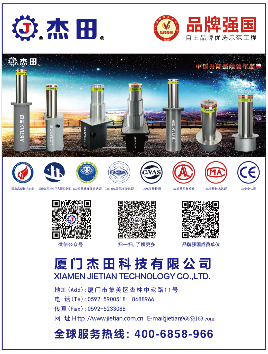 十五年來,公司不僅積累了豐富的經(jīng)驗,在行業(yè)內(nèi)擁有了良好的口碑,公司的發(fā)展也越來越好。目前,杰田科技擁有多項產(chǎn)品發(fā)明專利,30多個實用新型專利和10個軟件著作權(quán),多款產(chǎn)品通過了GA/T 1343-2016《防爆升降式阻車路障》公安部行業(yè)標(biāo)準(zhǔn)型式檢測報告,榮獲“廈門市高新技術(shù)企業(yè)”和“國家高新技術(shù)企業(yè)” “廈門市科技小巨人領(lǐng)軍企業(yè)” 和“福建省科技小巨人領(lǐng)軍企業(yè)”“ 廈門市守合同重信用企業(yè)”“2021中國品牌影響力100強” “中國升降柱十大品牌”等榮譽稱號。