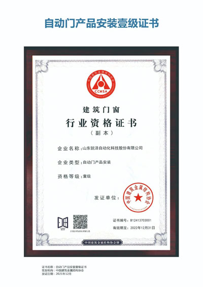 守匠于心,精進(jìn)于行,二十年潛心積淀,銳澤正一步一個腳印發(fā)展壯大。自動門產(chǎn)品制造、安裝雙壹級資質(zhì)的取得,既是肯定和認(rèn)可,同時也是激勵與鞭策。未來,我們將不斷研發(fā)創(chuàng)新,深化服務(wù),延伸品牌影響力,推進(jìn)企業(yè)實現(xiàn)更大的發(fā)展!