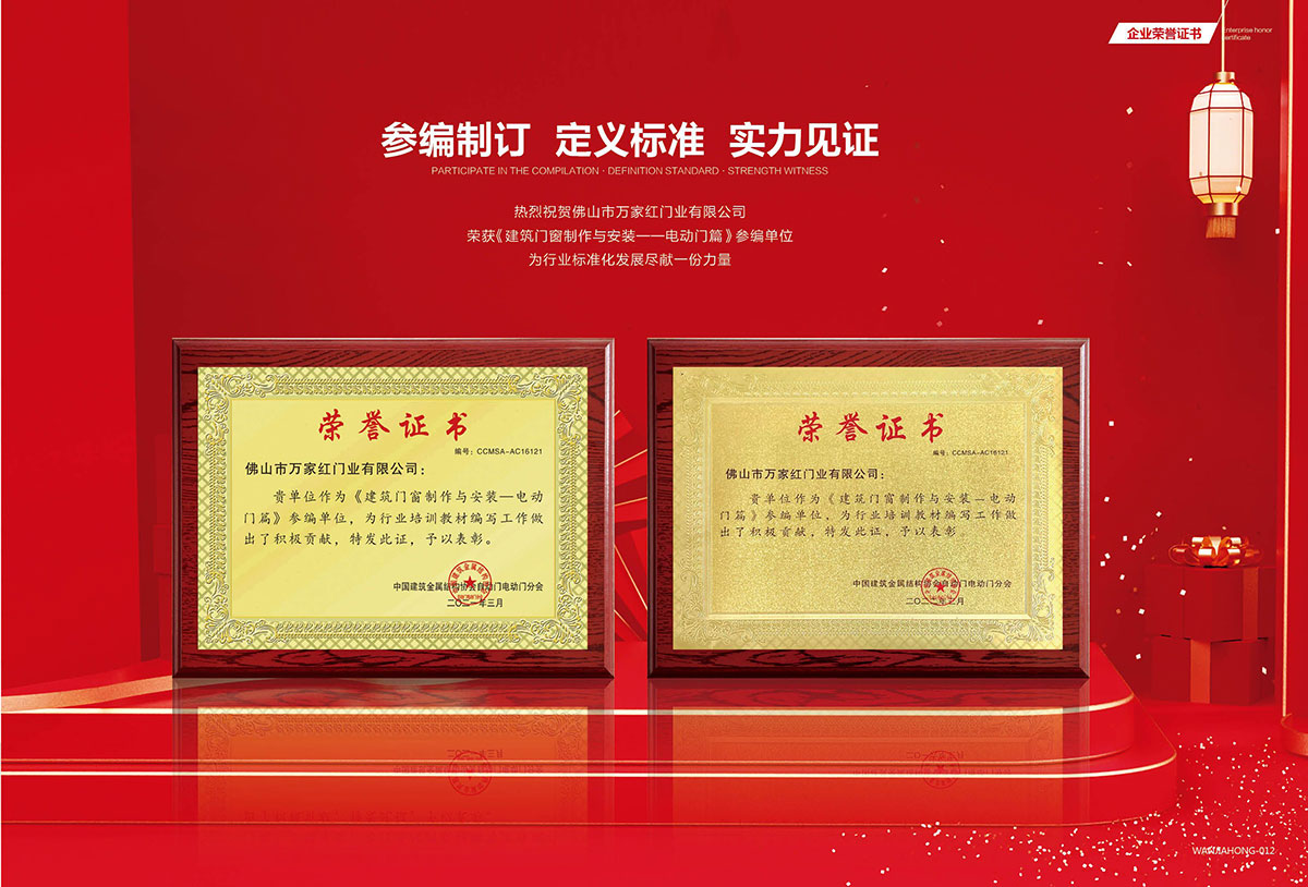 熱烈祝賀佛山市萬家紅門業(yè)有限公司榮獲《建筑門窗制作與安裝--電動(dòng)門篇》參編單位,為行業(yè)標(biāo)準(zhǔn)化發(fā)展盡獻(xiàn)一份力量。