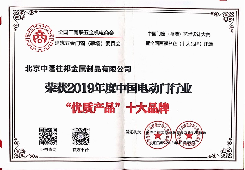 公司通過ISO9001--2008質(zhì)量體系認證,先后獲得全國房地產(chǎn)總工工作委員會頒發(fā)的【全國房地產(chǎn)總工優(yōu)選品牌】,門窗五金協(xié)會頒發(fā)的電動門行業(yè)的【全國伸縮門、推拉門十強企業(yè)】,【優(yōu)秀工程十大品牌】,【優(yōu)質(zhì)產(chǎn)品十大品牌】,【優(yōu)秀供應(yīng)商十大品牌】,【企業(yè)質(zhì)量信用AAA等級】等。