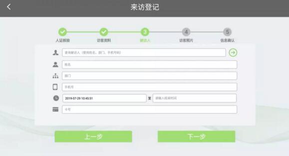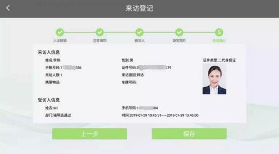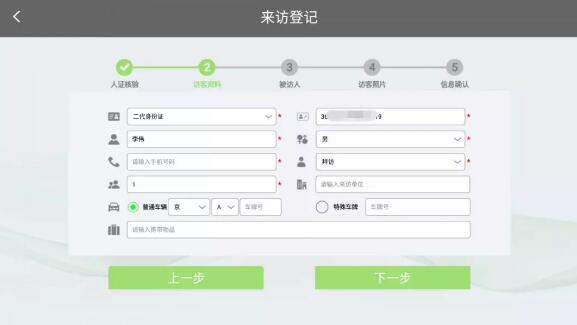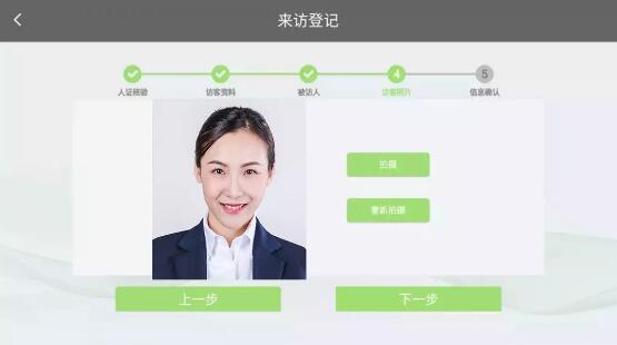 登記流程:人證核驗/手動登記——完善訪客信息——選擇被訪人、填入來訪時間——錄入人臉——信息確認,打印憑條。