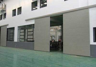平移式工業(yè)門在門洞上下裝有導軌,門扇置于兩道軌中間,通過齒輪傳動,實現(xiàn)左右啟閉。平移方式的工業(yè)門對建筑上下空間限制小,但要求門洞左右兩邊有足夠的空間放置門體,啟閉平穩(wěn)可靠,手動輕松自如。一般用于倉庫、工業(yè)廠房